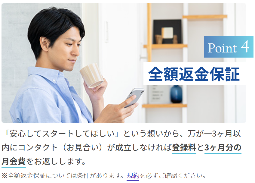 エン婚活エージェントの全額返金保証とは、活動開始後3ヵ月以内にお見合いが成立しなかった場合に登録料と3ヵ月分の月会費を返金してもらえる制度です。